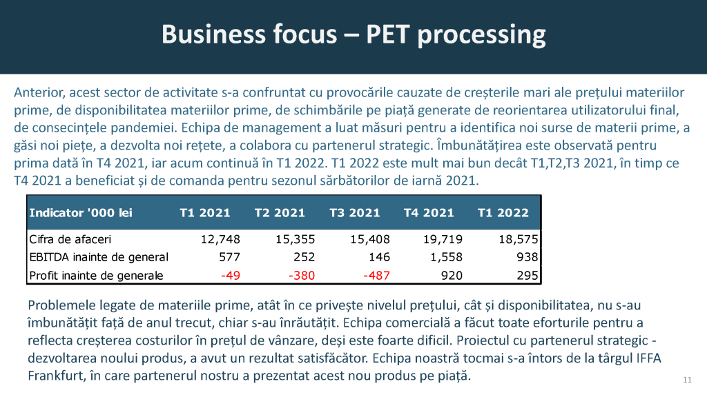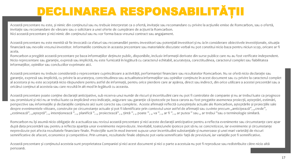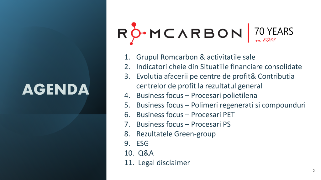 Joi, 19 Mai 2022, între orele 10:30-11:50, ora locală, a avut loc o teleconferință privind rezultatele financiare ale Romcarbon în primele 3 luni ale anului 2022.