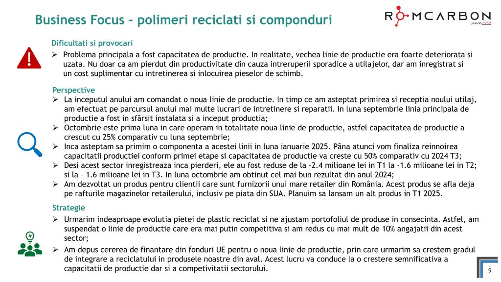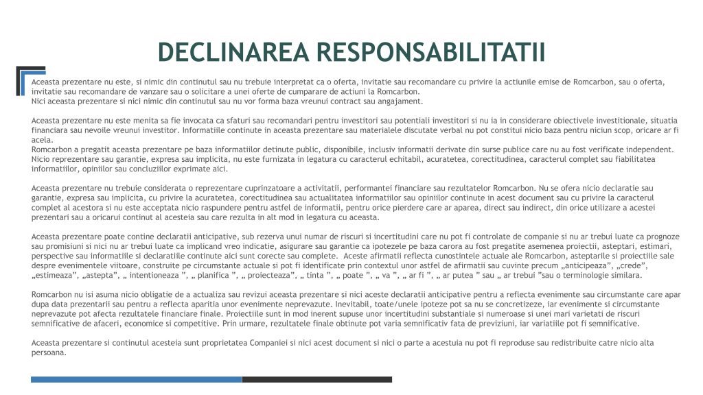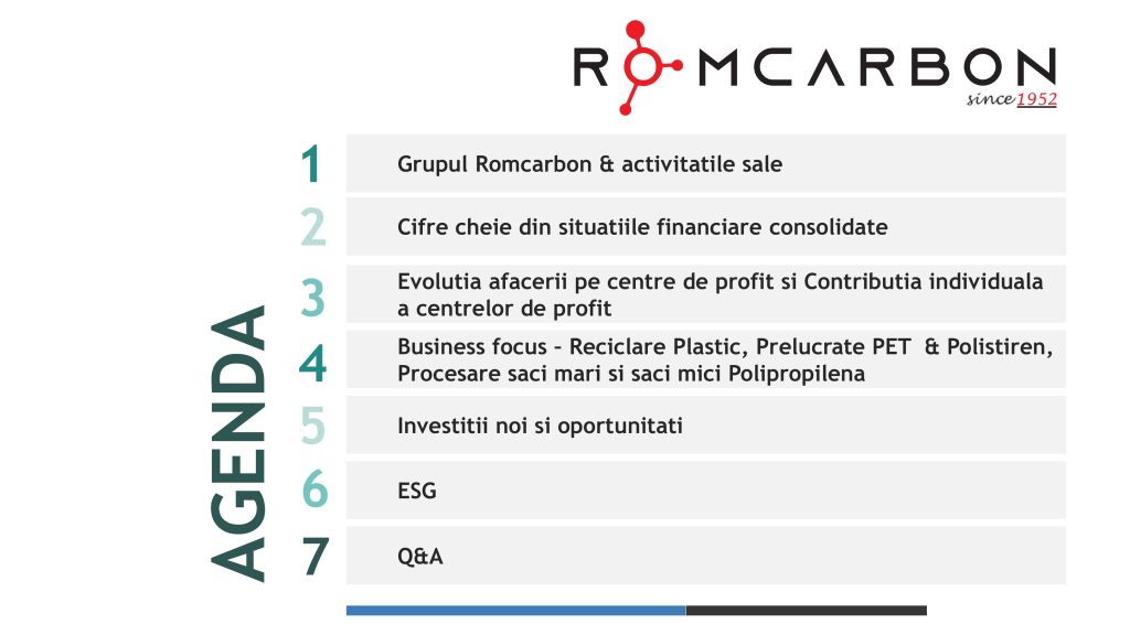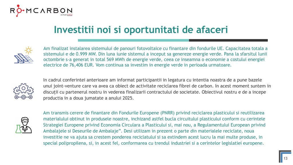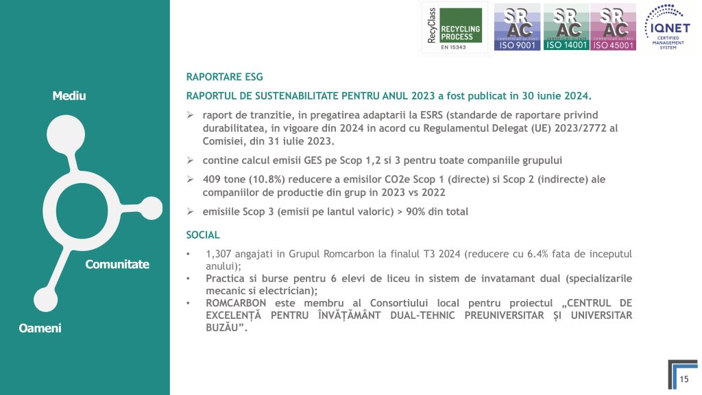 Miercuri, 20 Noiembrie 2024, între orele 10:30-12:00, ora locală, a avut loc o teleconferință privind rezultatele financiare ale Romcarbon S.A. la 9 luni 2024.