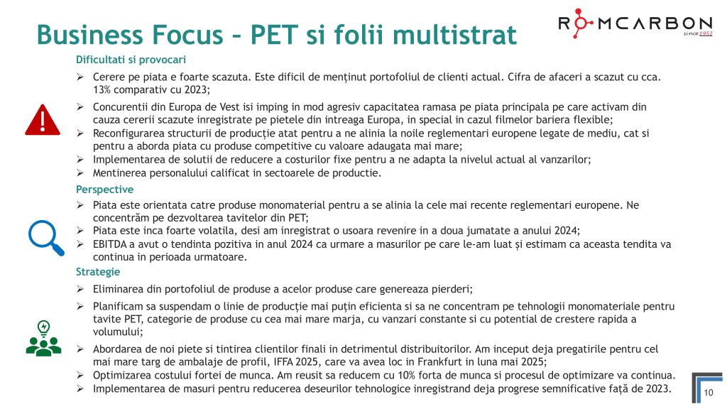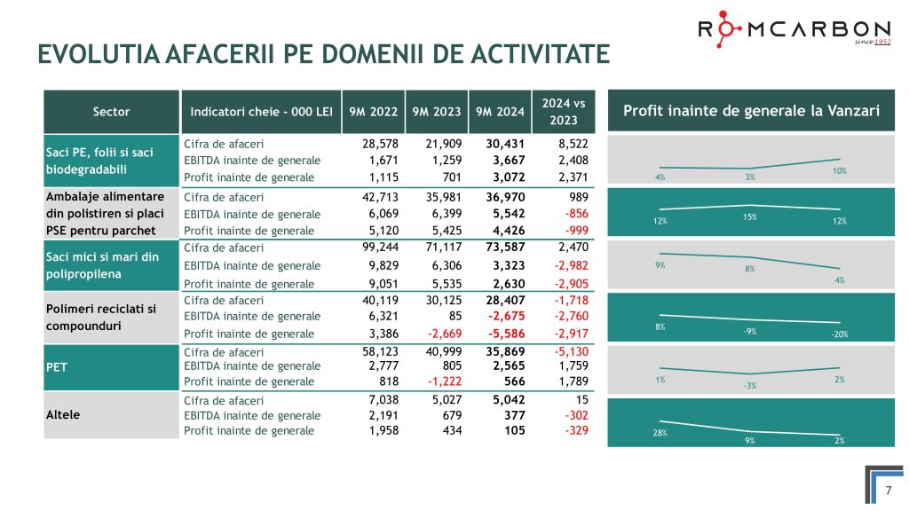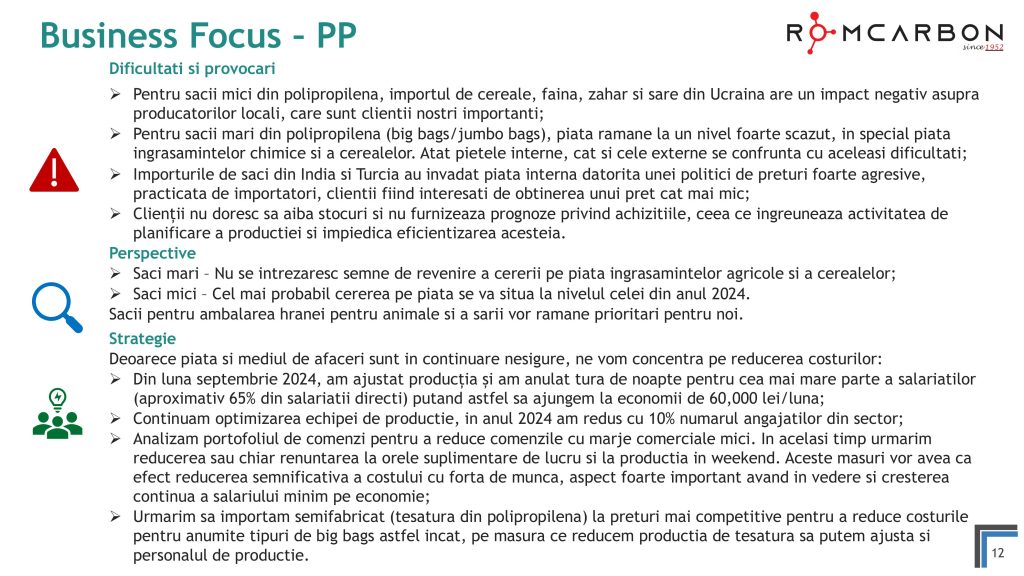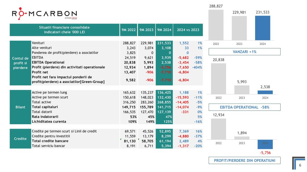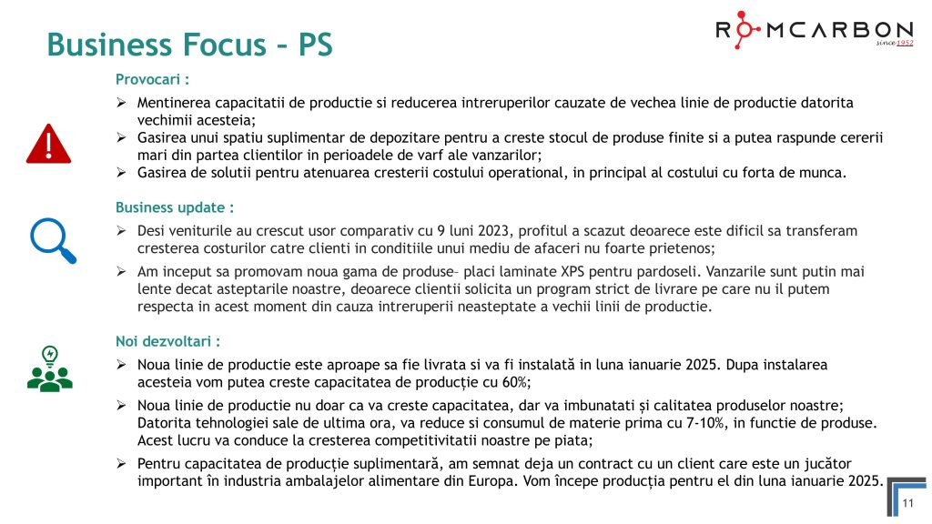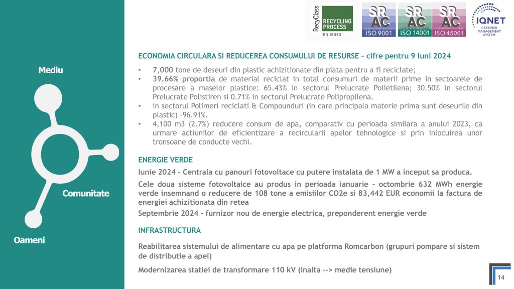Miercuri, 20 Noiembrie 2024, între orele 10:30-12:00, ora locală, a avut loc o teleconferință privind rezultatele financiare ale Romcarbon S.A. la 9 luni 2024.